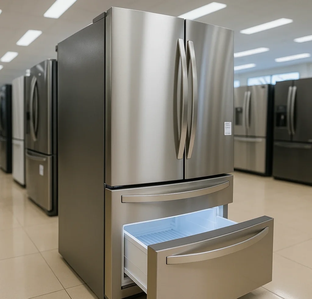LG focuses on food care and quiet operation. InstaView Door-in-Door lets you knock to light the door and grab frequent items without dumping cold air. Many French-door models add a “Full-Convert” middle drawer that can shift from soft-freeze to chiller to fridge temps, and “Craft Ice” (on select models) makes slow-melt spheres for entertaining. LG’s counter-depth offerings keep a clean built-in look, while standard-depth models push into the high-20s cu ft for families. Top picks: InstaView French-door with Full-Convert drawer, 4-door models with dual ice, and counter-depth InstaView for tighter kitchens. Pros: excellent produce performance and quiet brushless compressors; cons: some designs trade door-bin space for style, and Craft Ice adds moving parts to maintain.